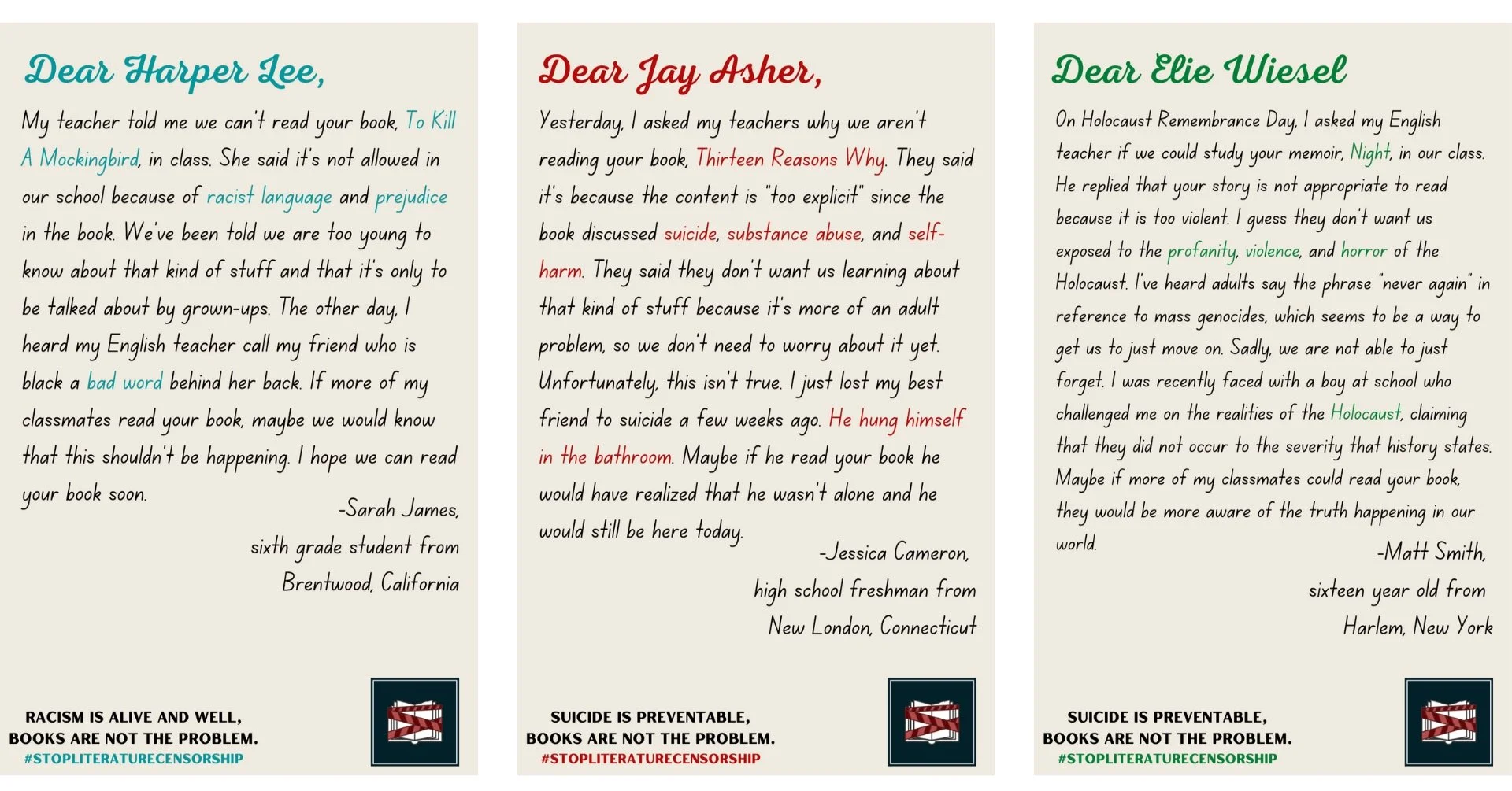 The Idea: Schools all across America are banning books due to “explicit” content on more mature topics. Students are being told that these themes in literature are innapropriate, but are watching the world issues of today, such as the George Floyd trial, unfold before their very eyes. What would a letter to these banned book authors look like? These issues, such as racism, teen suicide, and mass genocides are still occuring in our world today, but books are not the problem.